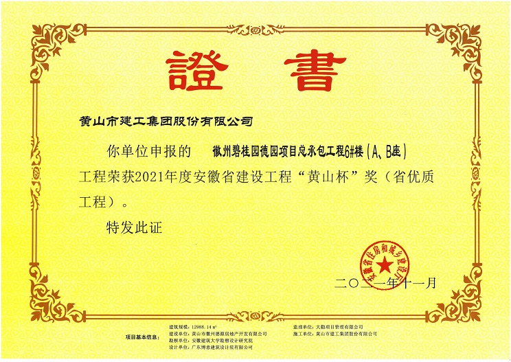 由米兰体育app_官方网站 承建的徽州区碧桂园德园项目总承包工程6#楼(A、B座) 工程荣获安徽省工程质量最高奖“黄山杯”奖。该工程在开工伊始,项目部就制订了创优目标,严格过程控制,建立健全项目质量管理体系,狠抓现场施工管理,把好施工过程质量控制关,为创精品工程打下坚实的基础。