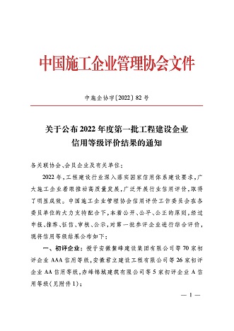 再次荣获施工企业最高信用评级“AAA级企业信用证书”。这是对米兰体育app_官方网站