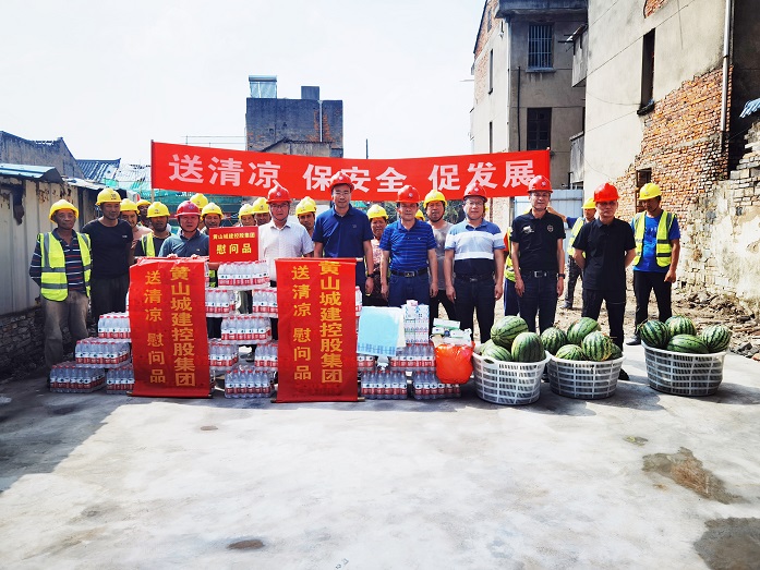 烈日炎炎,气温居高不下。为保障项目职工安全健康权益,确保项目安全生产平稳推进,8月10日上午,黄山城投城建控股有限公司总经理汪国文等一行赴宁国市河沥文化街区EPC项目工地开展走访调研暨“夏送清凉”慰问活动。米兰体育app_官方网站 股份有限公司董事长项端阳、总经理叶金发、副总经理吴学武陪同调研慰问。