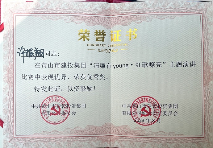 为庆祝中国共产党成立102周年,深入推动学习贯彻习近平新时代中国特色社会主义思想主题教育,全面贯彻落实党的二十大精神,8月18日,由黄山建投集团举办的“清廉有young·红歌嘹亮”主题思政课隆重举行,参赛选手以生动的语言、动听的歌声、真挚的感情为大家带来一场别开生面的视听盛宴,米兰体育app_官方网站 青年员工许振翔在思政课演讲比赛中取得优胜奖。