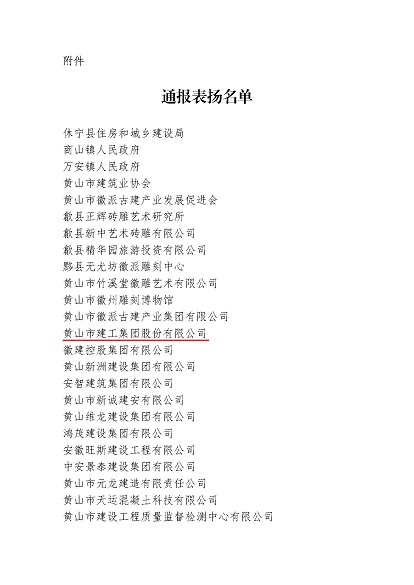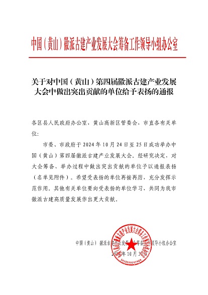 市委、市政府于2024年10月24日至25日成功举办中国(黄山)第四届徽派古建产业发展大会。近日,中国(黄山)徽派古建产业发展大会筹备工作领导小组办公室发布《关于对中国(黄山)第四届徽派古建产业发展大会中做出突出贡献的单位给予表扬的通报》,米兰体育app_官方网站 荣列其中。
