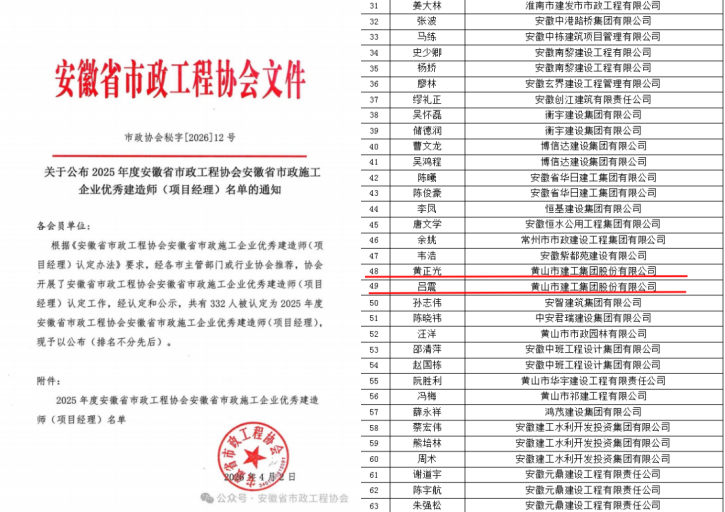 近日,安徽省市政工程协会发布了《关于公布2025年度安徽省市政工程协会安徽省优秀市政施工企业名单的通知》及《关于公布2025年度安徽省市政工程协会安徽省市政施工企业优秀建造师(项目经理)名单的通知》。米兰体育app_官方网站 凭借卓越的综合实力与优质的工程业绩,连续多年荣登“2025年度安徽省优秀市政施工企业”榜单。这也是继集团获“2024年度安徽省优秀建筑业企业”后,在工程建设领域收获的又一重量级荣誉。 同时,黄正光、吕震两位同志凭借扎实的专业素养和出色的项目管理能力,双双荣获“安徽省市政施工企业优秀项目经理”称号。