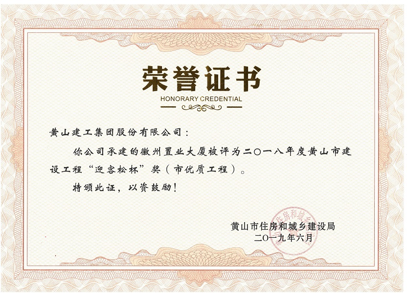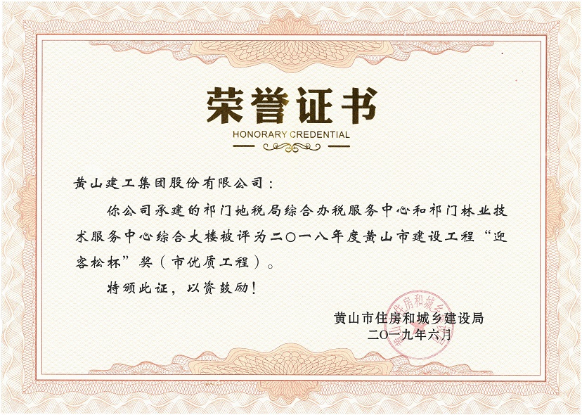 2019年度黄山市建设工程优质工程奖