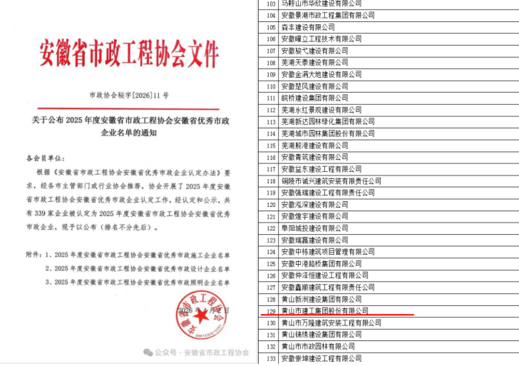 近日,安徽省市政工程协会发布了《关于公布2025年度安徽省市政工程协会安徽省优秀市政施工企业名单的通知》及《关于公布2025年度安徽省市政工程协会安徽省市政施工企业优秀建造师(项目经理)名单的通知》。米兰体育app_官方网站 凭借卓越的综合实力与优质的工程业绩,连续多年荣登“2025年度安徽省优秀市政施工企业”榜单。这也是继集团获“2024年度安徽省优秀建筑业企业”后,在工程建设领域收获的又一重量级荣誉。 同时,黄正光、吕震两位同志凭借扎实的专业素养和出色的项目管理能力,双双荣获“安徽省市政施工企业优秀项目经理”称号。
